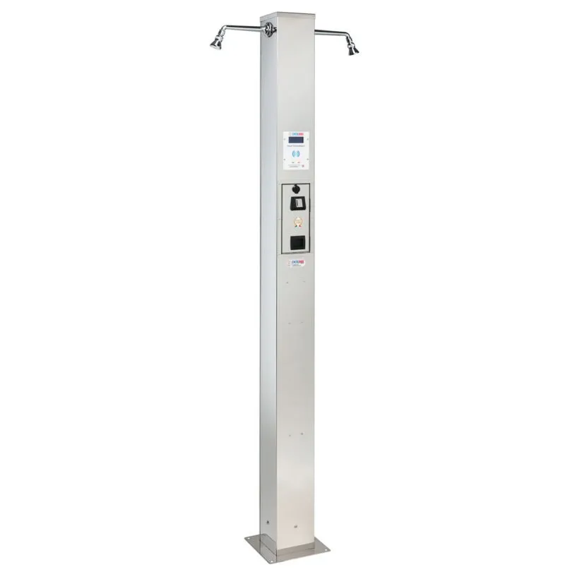 Con gettoniera a gettone o moneta, oppure con tessera o braccialetto. Fornita di flangia per il fissaggio a terra.